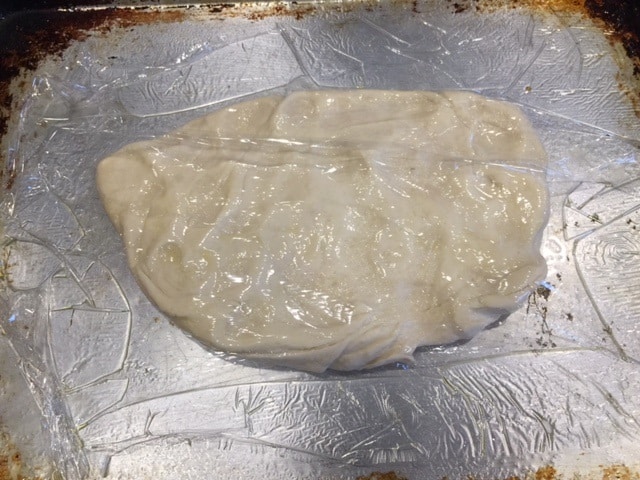 4. First forming – First we spread a good tablespoon of olive oil on the baking sheet. Then take the dough out of the bag put it on the oiled baking sheet, and punch it down until it’s kind of flat. Then rub a small amount of oil on top of the dough and let it rest for about 30 minutes covered with plastic wrap. Letting the dough rest makes it easier to spread out and also lets the dough rise a bit to get it those crunchy bubbles.