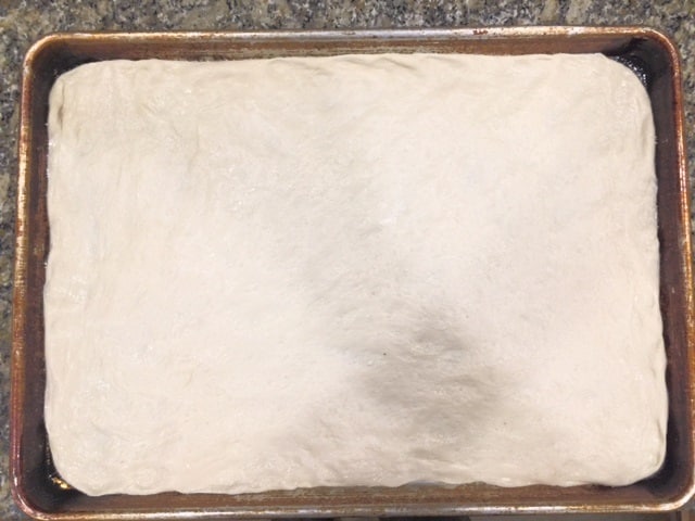 5. Final Push – After Letting the dough rest, it’s time to make the final shape. Letting the dough rest lets it rise a bit more and warm up. It also softens the dough a bit so it’s easier to form. Push the dough out towards all the corners, filling the sheet pan. If it doesn’t want to go all the way to the corners, let it rest for another 10 minutes and try again until it goes to the corners. If you tear a hole in the dough, just fold over a little section over the hole and seal the hole. It will be fine.
