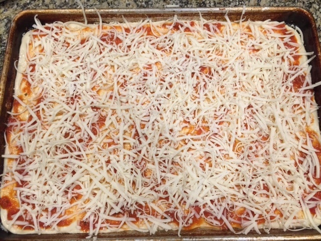 7. Add The Cheese – Now add the shredded cheese on top. Again, like the sauce, don’t put too much on or it becomes an oily mess, especially with pepperoni. I like to use either Trader Joe’s Shredded Mozzarella or the Quattro Formaggio. You should be able to see the sauce through the cheese.
