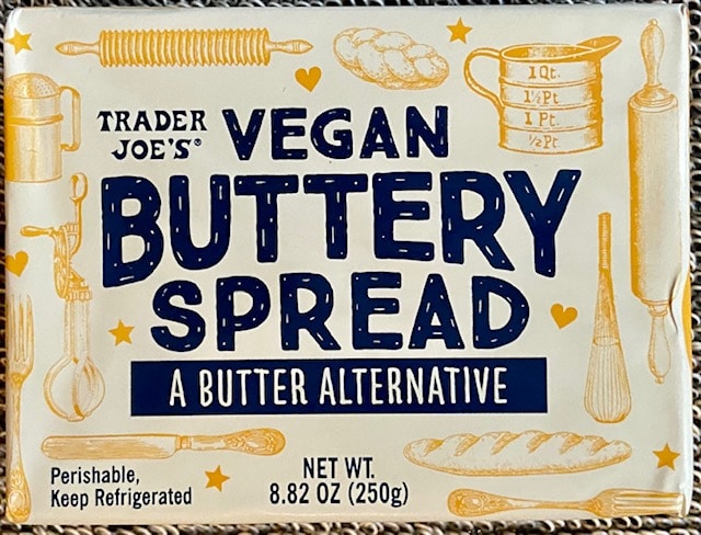 Because we are trying to eat more vegan products, I decided to take a deep dive into Trader Joe’s Vegan Buttery Spread. Right away I noticed the large rectangular block, instead of the sticks of butter that we normally get in this country and I turned over the block and sure enough it read “Product of Germany”. Having lived in Germany for a while, I know that they take their butter very seriously and when I lived there the butter was so much better than any butter I had had in the USA, it was shocking. It’s great you can find these European kinds of butter in the USA these days, but that wasn’t always the case.